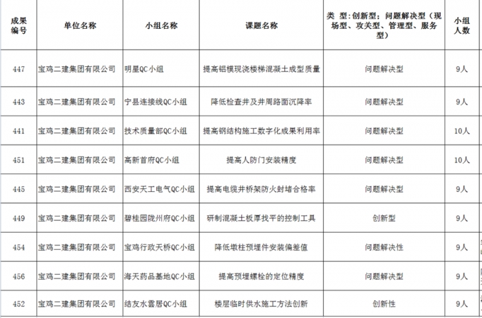 近日,從陜西省建筑業(yè)協(xié)會(huì)獲悉,在“2022年陜西省工程建設(shè)質(zhì)量管理小組競賽活動(dòng)”中,集團(tuán)公司17項(xiàng)成果從2119個(gè)成果中脫穎而出,一次性獲得一類成果9項(xiàng),二類成果4項(xiàng),三類成果4項(xiàng)。其中技術(shù)質(zhì)量部QC小組的《提高鋼結(jié)構(gòu)施工數(shù)字化成果利用率》和碧水潤園QC小組的《研制一種控制混凝土板厚的裝置》被推薦參加國家QC小組成果發(fā)布。集團(tuán)公司榮獲“2022年陜西省質(zhì)量管理小組活動(dòng)先進(jìn)企業(yè)”稱號(hào),并連續(xù)八年獲此殊榮。
