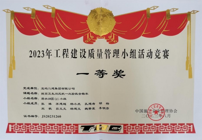最終,碧水潤園QC小組“提高衛(wèi)生間反坎一次驗收合格率”榮獲2023年工程建設(shè)質(zhì)量管理小組活動競賽一等獎,技術(shù)質(zhì)量部QC小組“提高屋面廣場磚施工驗收合格率”榮獲2023年工程建設(shè)質(zhì)量管理小組活動競賽三等獎,明星QC小組“高層泵管清洗水處理技術(shù)創(chuàng)新”榮獲2023年工程建設(shè)質(zhì)量管理小組活動競賽三等獎。